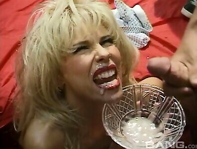 Retro mass ejaculation porn with a light-haired tart in red lip liner