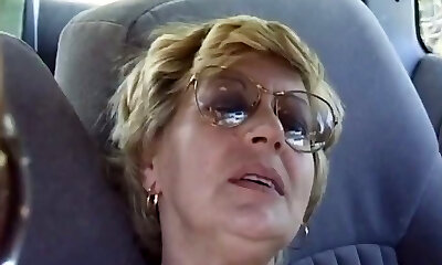Mature Pauline fingers her old beaver in a car and gets poked