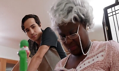 ультра-кудрявая медсестра жасмин темного оттенка демонстрирует свои сиськи размером с батат и насаживает его салями