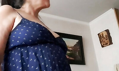 возбужденная мамаша трахает себя длинным дилдо, а затем скачет верхом на большом члене, пока не кончает